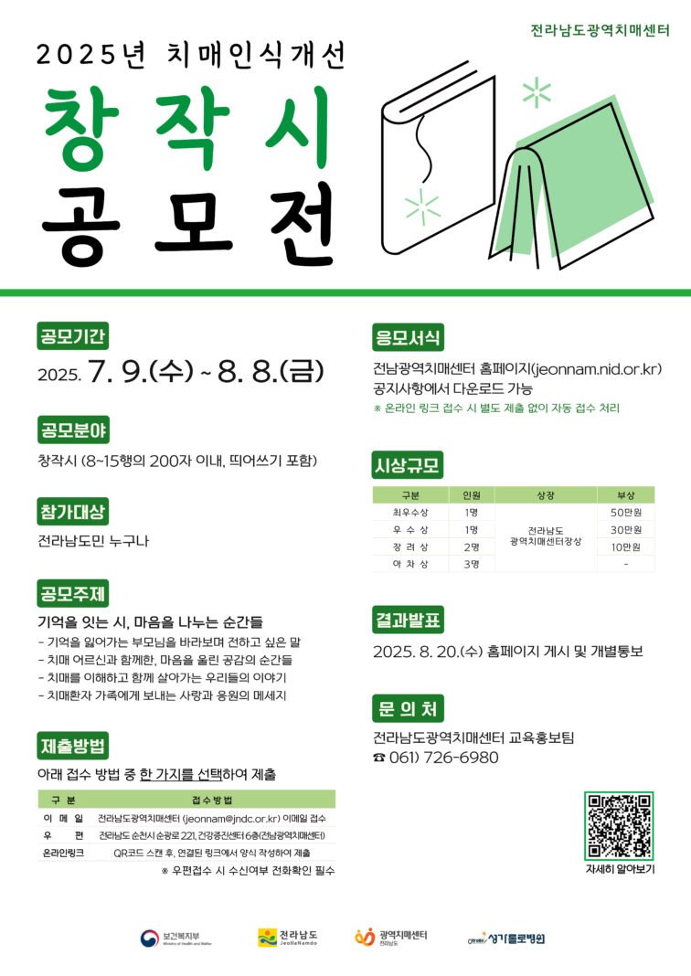 전라남도광역치매센터가 치매에 대한 사회적 공감대 형성과 인식개선을 위해 ‘2025 치매인식개선 창작시 공모전’을 8월 8일까지 진행한다.