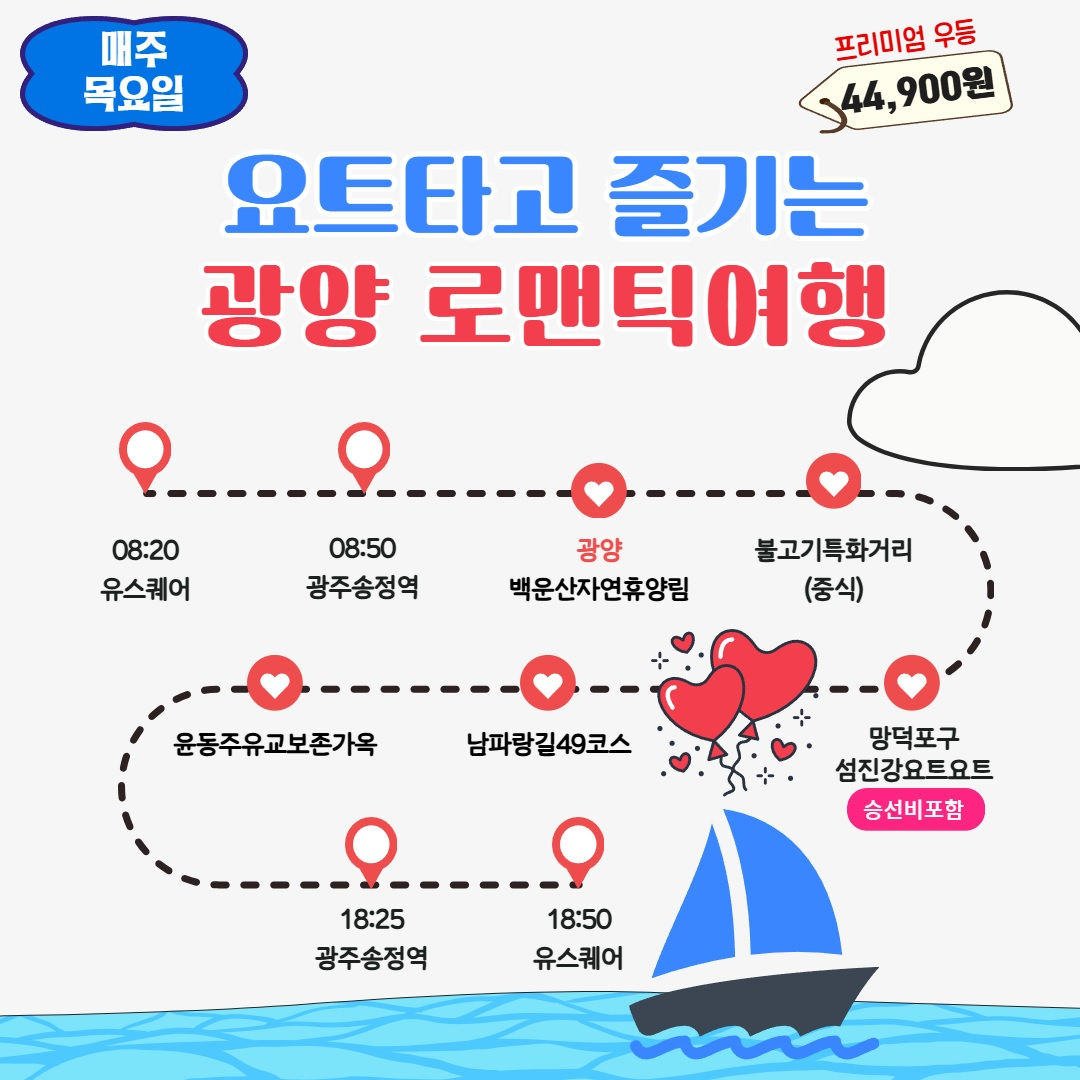 투어일정은 ▲유스퀘어(오전 8시 20분) ▲송정역(오전 8시 50분) ▲백운산 자연휴양림 ▲불고기 특화거리 ▲망덕포구 요트체험 ▲남파랑길 49코스 ▲윤동주 유고보존 가옥을 거쳐 ▲송정역(오후 6시 25분) ▲유스퀘어(오후 6시 50분)로 돌아오는 코스다.