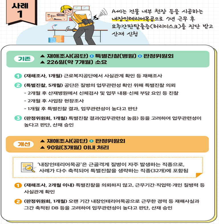 대표적인 사례가 근골격계 질병이다. 내장 인테리어 목공, 건축석공, 환경미화원, 중량물 배달원 등 32개 직종은 이미 다수의 사례가 축적돼 있어 특별진찰 없이 판정이 가능하다.