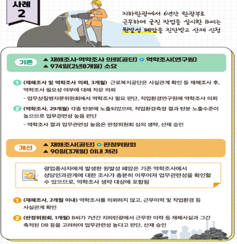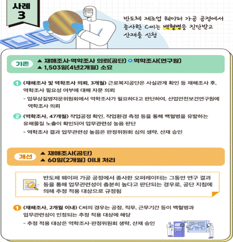 노동부는 이런 병목을 줄이기 위해 직종·질병별로 이미 인과관계가 충분히 입증된 경우에는 특별진찰이나 역학조사 없이 근로복지공단의 재해조사와 판정위원회 심의만 거치도록 개선한다.