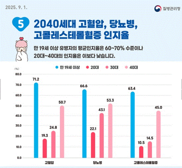 2040세대는 질환 있어도 모르는 경우 많아 치료와 관리 시기를 놓쳐 큰 낭패를 당하기 쉽다. 질병관리청은 2040세대 건강관리의 시작은 혈압·혈당·콜레스테롤부터 챙겨야 한다고 당부했다.