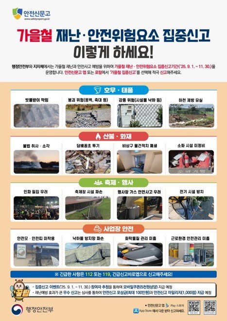 시는 가을철 발생 가능성이 높은 재난·안전사고를 예방하기 위해 축제·행사, 호우·태풍, 산불·화재, 사업장 안전 등 4개 유형을 신고 대상으로 정했다. 각 유형은 계절적 특성과 최근 이슈를 고려해 선정됐다.