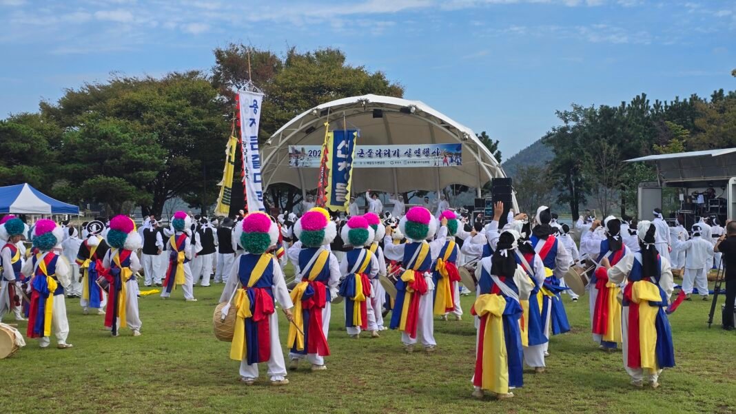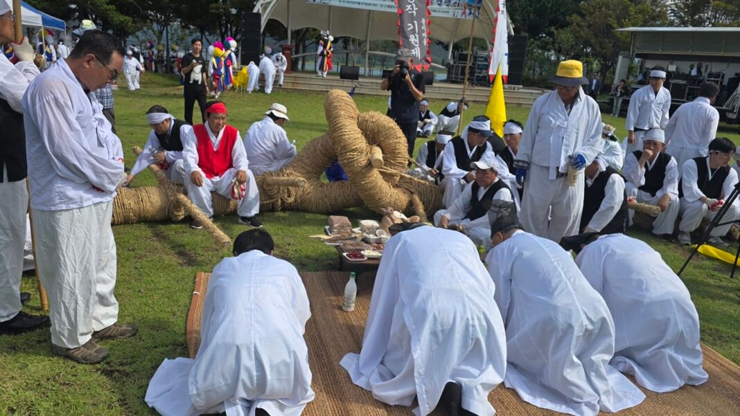 용지큰줄다리기 편가르기와 길놀이는 전통적으로 마을 지형(골목·경계)에 따라 안몰과 선창몰로 나뉘어 두 편이 형성된다. 암줄은 ‘황룡’을, 수줄은 ‘청룡’을 의미하며, 용이 산다는 연못 전설과 맞물려 마을의 정체성을 보여준다. 편을 나누는 과정은 경쟁의 시작을 알리는 동시에 주장 선출과 역할 분담 등 마을 내부 질서를 확인하는 의례적 절차다. 길놀이에서는 줄을 마을 중심과 길을 따라 한 바퀴 도는데, 이는 마을 전체를 축복하고 행사 시작을 알리는 공개 의식이다. 풍물·농악의 장단이 마을 곳곳에 울려 퍼지며 주민 참여를 촉진하고, 관객들도 행사에 합류해 축제 분위기를 만든다. 역사적으로는 태인도가 우리나라 김 시배지라는 점과 맞물려 마을 공동체의 생계와 연결된 의례로 전승돼왔다. 사진=배진연용지큰줄다리기 진잡이는 본 줄다리기에 앞서 진행되는 예비의례로, 상대의 기를 눌러 사기를 꺾고 우리 편의 기세를 높이는 심리전이다. 이 과정에서 두 줄이 주고받는 줄소리(후렴구)가 발달해 웅장한 분위기를 만들며, 참여자들은 발 구르기 등을 통해 몸을 풀어 부상을 예방한다. 태인동의 진잡이는 특히 장단과 후렴이 발달해 장면 자체가 공연적 클라이맥스로 여겨진다. 사진=배진연고걸이는 암줄과 수줄을 ‘고’로 단단히 걸어 하나의 대형 줄로 결속시키는 기술적·의례적 과정이다. 이때 불리는 줄소리는 해학적이고 익살스러운 내용이 많아 관객을 웃게 하며, 이는 고걸이 줄소리 전통으로 이어져왔다. 고걸이는 단순한 물리적 결합을 넘어 ‘마을 두 힘의 결합’이라는 상징적 의미를 지닌다. 연결 작업은 안전과 공정성을 위해 경험 많은 어른이 주도한다. 사진=배진연제의는 김 풍작을 기원하는 의식으로, 용왕제는 바다와 김 양식에 직결된 의례다. 태인도가 한국 최초의 김 양식지라는 지역적 배경(김여익의 기록, 1664년경 전승) 위에서 이어져 왔다. 제의는 신과 조상에게 제물을 올려 풍어와 풍작, 마을의 안전을 기원하는 엄숙한 순간으로, 줄다리기 전체에 신성성을 부여한다. 관객에게는 이 장면이 행사 취지인 농어민의 생업과 공동체 보호를 가장 직접적으로 설명해 주는 부분이 된다. 사진=배진연줄다리기는 공연의 피날레이자 핵심 장면으로, 두 편이 중앙선을 두고 힘을 겨룬다. 용지큰줄다리기는 줄 둘레가 약 1m, 길이가 약 40m에 달하는 대형 줄을 사용하며, 곁줄을 달아 당김의 힘을 분산시키고 안전을 확보한다. 승패는 때로 2~3시간, 혹은 그 이상에 걸쳐 결정되며, 줄을 오래 끌수록 풍년과 풍어의 의미가 크다고 전해진다. 또한 지역 관습상 여성은 줄다리기에서 배제되는 전통이 있어 문화적 맥락으로 소개된다. 사진=배진연뒤풀이는 승패와 관계없이 행사를 마무리하며 공동체가 다시 하나로 모이는 시간이다. 제물 일부를 나누어 먹고 줄다리기의 경험을 세대 간에 전수하며 관계 회복과 축복을 나눈다. 뒤풀이는 갈등 해소, 전승 교육, 관계 강화 등 전통의 사회적 기능을 모두 담아내는 잔치다. 사진=배진연