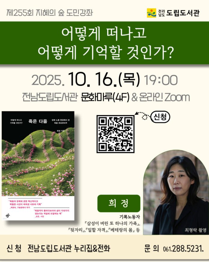 전남도립도서관은 "어떻게 떠나고 어떻게 기억할 것인가?"를 주제로 기록노동자 희정 작가를 초청해 오는 10월 16일 오후 7시 도서관 4층 문화마루와 온라인 줌(Zoom)에서 제255회 지혜의 숲 도민강좌를 개최한다. 홍보물=전남도립도서관