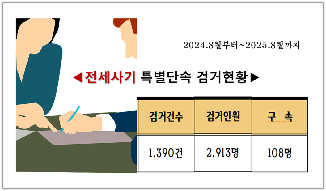 국토교통부, 대검찰청, 경찰청은 전세사기 근절을 위해 2022년 7월부터 실시해온 범정부 특별단속에서 지난해 8월부터 1년간 전세사기 사범 2913명을 검거했다고 지난 9월 30일 밝혔다.