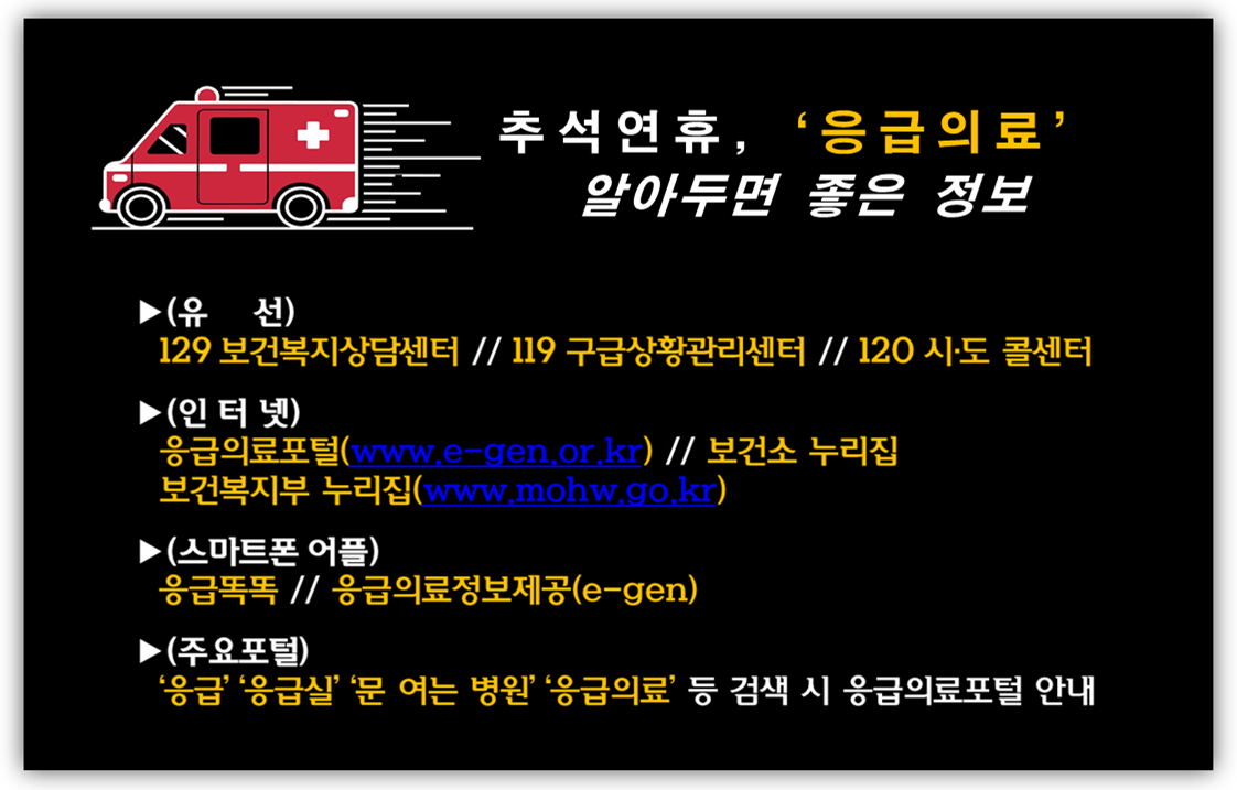 연휴 중 몸이 아프면 먼저 문을 여는 동네 병·의원이나 지역응급의료기관(232개소), 응급의료시설(113개소) 등 작은 응급실을 찾는 게 좋다. 경증이면 그곳에서 치료를 받으면 되고, 중증질환이 의심되면 큰 병원으로 신속히 이송할 수 있다.