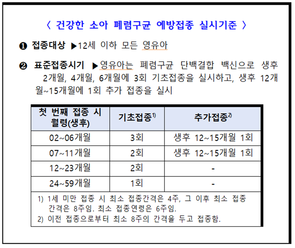 접종 대상은 생후 59개월(만 5세) 이하 영유아와 18세 이하 폐렴구균 고위험군이다. 고위험군은 면역 저하나 만성질환이 있거나 인공와우를 이식한 소아청소년을 말한다.