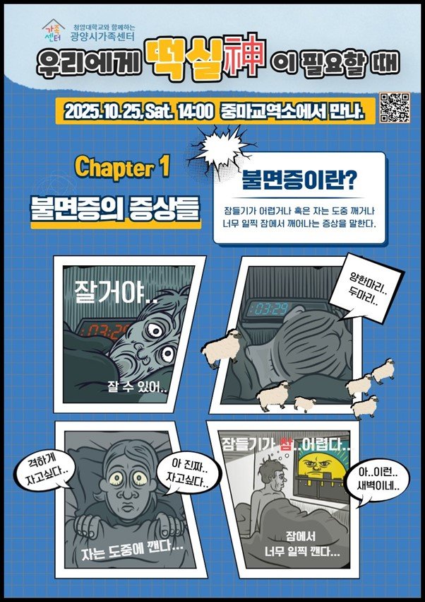 광양시가족센터가 오는 10월 25일 오후 2시, 중마동 덕진봄 건너편 중마교역소에서 대규모 상담콘서트 ‘떡실신(神) 낮잠 프로젝트–오늘 낮잠 어때?’를 개최한다.