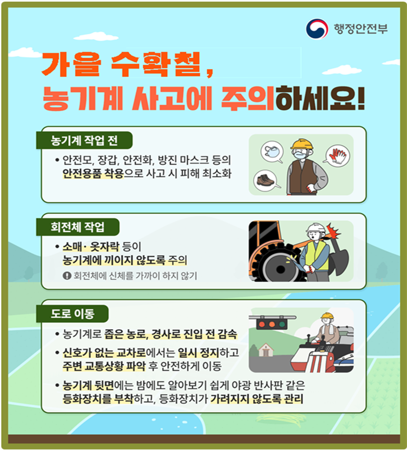 행안부는 농기계 사고 예방을 위해 ▲간소한 복장 및 작업모 착용 ▲수건 등 회전체에 말릴 수 있는 물건 착용 금지 ▲비탈길·모퉁이·경사로 통행 시 감속 ▲도로 운행 시 교통법규 준수 ▲야간 운행 시 등화장치 부착 및 반사판 관리 ▲수확물 적재 시 규격 및 높이 준수 등을 강조했다.