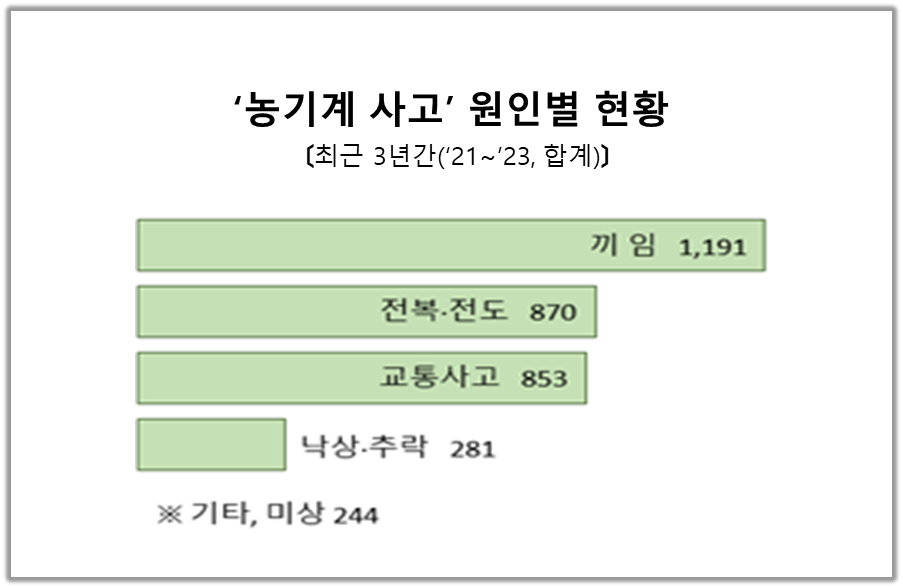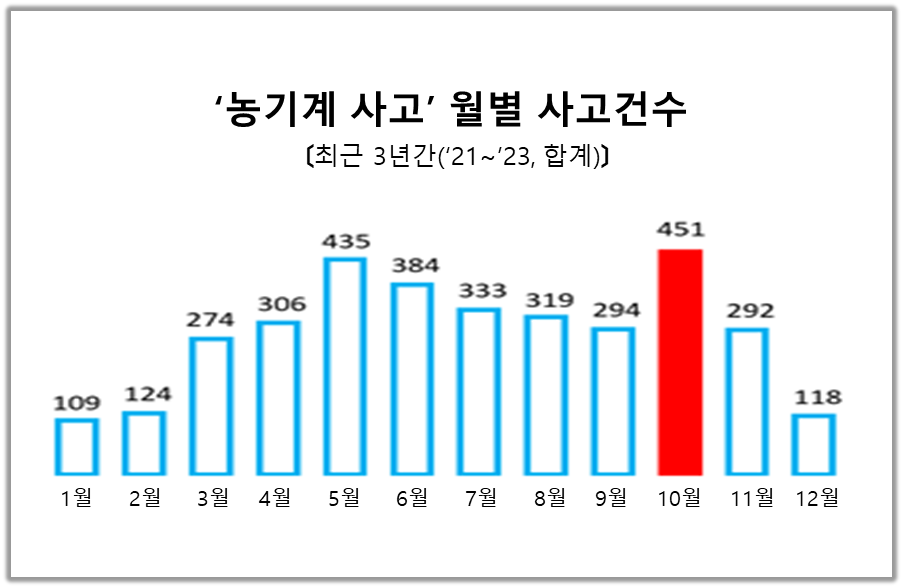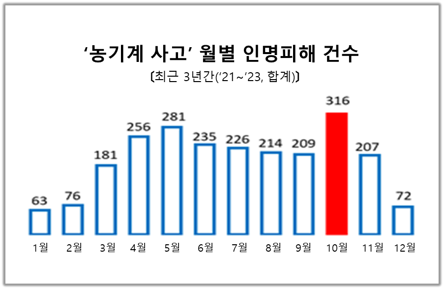 최근 3년간(2021~2023년) 통계에 따르면 10월 한 달 동안 발생한 농기계 사고는 451건으로 연중 최다를 기록했으며, 이로 인한 인명피해는 316명으로 가장 많았다. 같은 기간 전체 농기계 사고는 3,439건으로, 2,366명(사망 192명, 부상 2,144명)의 인명피해가 발생했다. 이는 하루 평균 3건 이상의 사고가 발생한 셈이다.