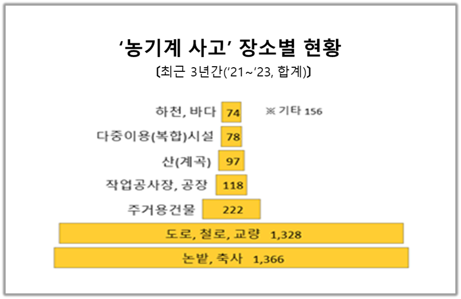 사고 원인별로는 기계에 끼임이 1,191건(34.6%)으로 가장 많았고, 농기계 전복·전도 870건(25.3%), 도로 교통사고 853건(24.8%), 낙상·추락 281건(8.2%) 순으로 나타났다. 장소별로는 논밭·축사가 1,366건(39.7%)으로 가장 많았으며, 도로·철로·교량에서도 1,328건(38.6%)이 발생해 이동 중 사고도 심각한 수준인 것으로 조사됐다.