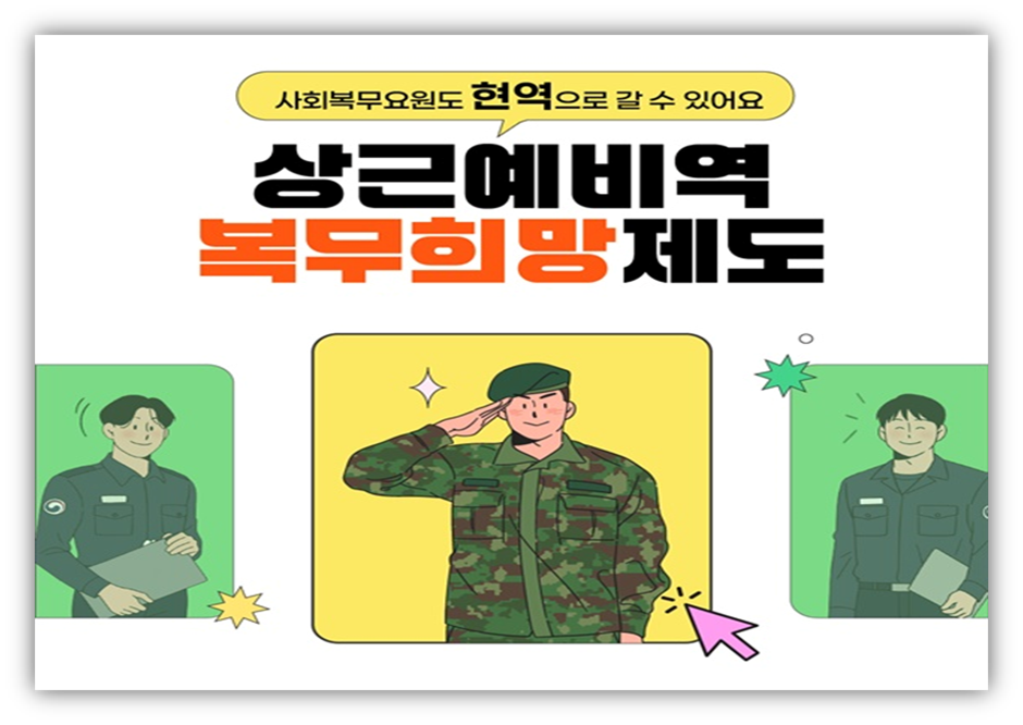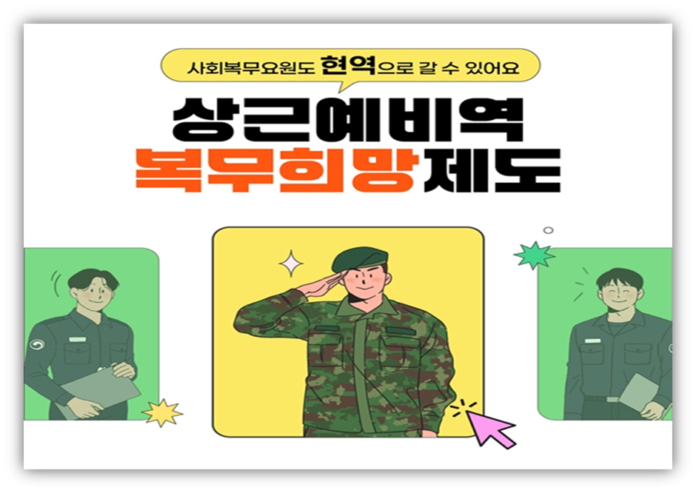 병무청은 사회복무요원 소집대상자 중 현역복무를 희망하는 이들이 상근예비역으로 복무할 수 있도록 ‘상근예비역 복무희망제도’를 운영하고 있다고 10월 16일 밝혔다. 이 제도는 현역병 입영 대상자와의 형평성을 고려해 마련됐다.