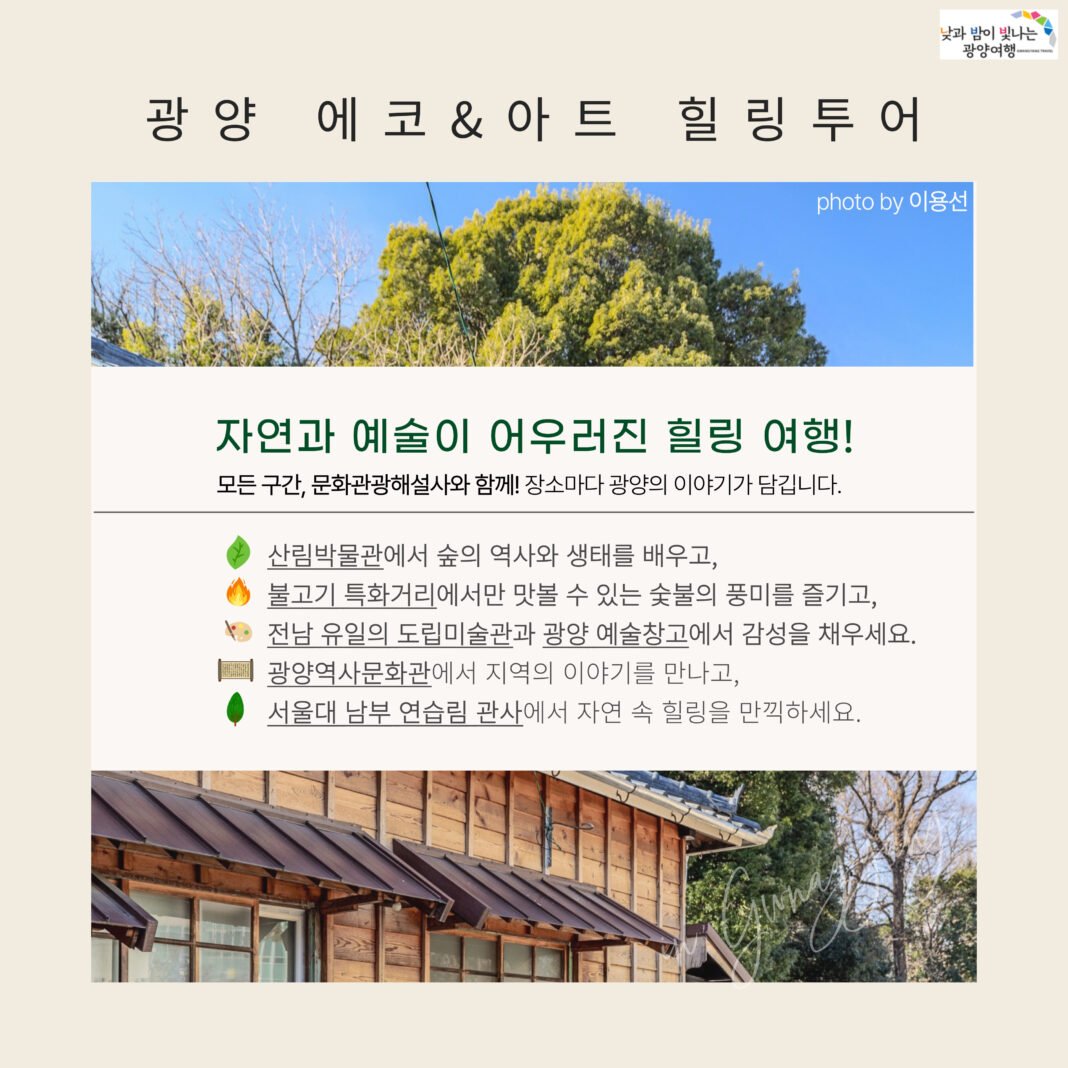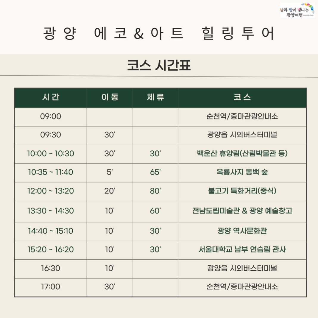 시는 ‘광양 에코·아트 힐링투어’ 운영 계획을 공지하며, 이번 투어는 천년의 숲 백운산 휴양림과 옥룡사지 동백숲 역사·문화체험, 불고기 특화거리 중식, 전남도립미술관·광양예술창고·광양역사문화관 탐방 등 역사·문화·감성여행으로 구성됐다고 설명했다.