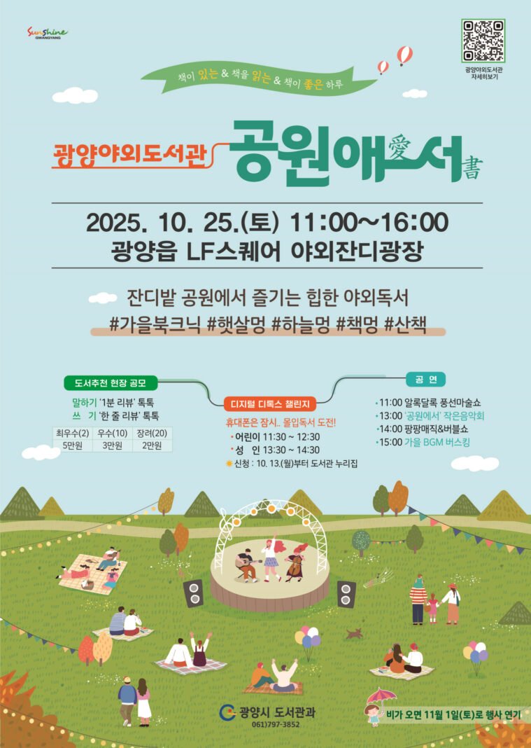 광양시는 오는 10월 25일 오전 11시부터 오후 4시까지 광양읍 LF스퀘어 야외잔디광장에서 ‘광양야외도서관 공원愛書’ 행사를 개최한다.