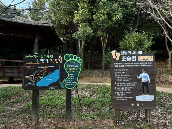 광양시 마동생태호수공원에 조성된 ‘맨발의 사나이 조승환 황톳길’은 사업비 3억5000만 원을 투입해 순환형으로 조성됐다. 총길이 700m, 노폭 1.5~3m 규모로 지난 2024년 9월 개장했다. 사진=문성식