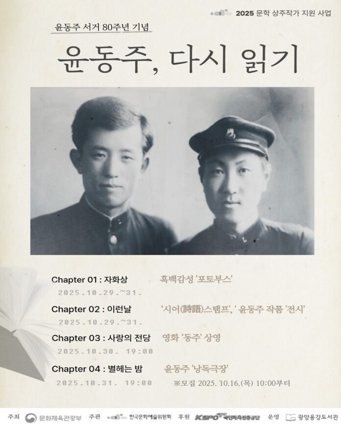 광양용강도서관은 윤동주 시인의 서거 80주년을 맞아 오는 10월 29일부터 31일까지 3일간 ‘윤동주, 다시 읽기’ 프로그램을 운영한다.