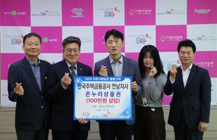 한국주택금융공사 전남지사(지사장 김진영)는 22일 광양시사랑나눔복지재단(이사장 김재경)에 온누리상품권 100만원 상당을 전달했다. 이번 기부는 지역사회를 위한 나눔 실천과 상생의 일환으로 마련됐다.