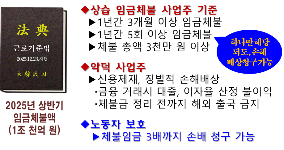상습체불 사업주는 금융거래 제한, 국가·지자체 보조사업 참여 제한 등 각종 제재를 받는다. 3개월분 이상 또는 5회 이상 총 3,000만 원 이상 임금을 체불하면 신용정보기관에 상습체불자로 등록되며, 명단이 공개된 사업주는 임금을 모두 청산하기 전까지 출국이 금지된다.