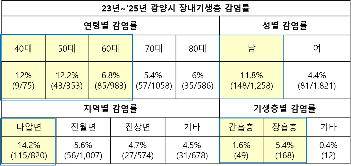 이 자료는 2023년부터 2025년까지 3년간 실시한 광양시 지역주민의 장내기생충 감염 실태 조사 결과를 정리한 것입니다. 자료=광양시, 자료정리=김대현