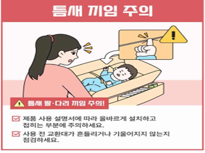 4일 ‘국가기술표준원'(이하 국표원)과 ‘한국소비자원'(이하 소비자원)에 따르면, 양육 부모들이 최근 가정 내에서도 편의성 때문에 기저귀 교환대를 사용하는 사례가 늘고 있다. 하지만 교환대 위에 영유아를 올려둔 채 눈을 떼거나 올바르게 설치되지 않은 상태로 사용하는 경우, 영유아 낙상이나 끼임 등의 사고가 발생할 수 있어 주의가 필요하다.