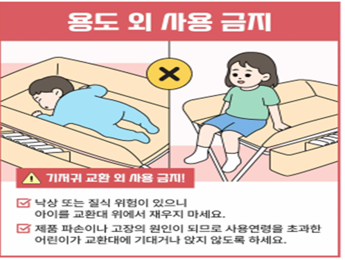 이에 국표원과 소비자원은 가정 내 기저귀 교환대의 안전한 사용을 위해, 기저귀 교환대 위의 아이에게서 눈을 떼지 말 것, 유지장치(벨트)가 있다면 반드시 착용시킬 것, 교환대 위에서 아이를 재우지 말 것, 교환대 틈새에 아이 팔·다리가 끼이지 않도록 주의할 것, 사용 전 질식 위험이 있는 작은 부품이 떨어져 있는지 확인할 것 등 안전 수칙을 지켜줄 것을 당부했다.