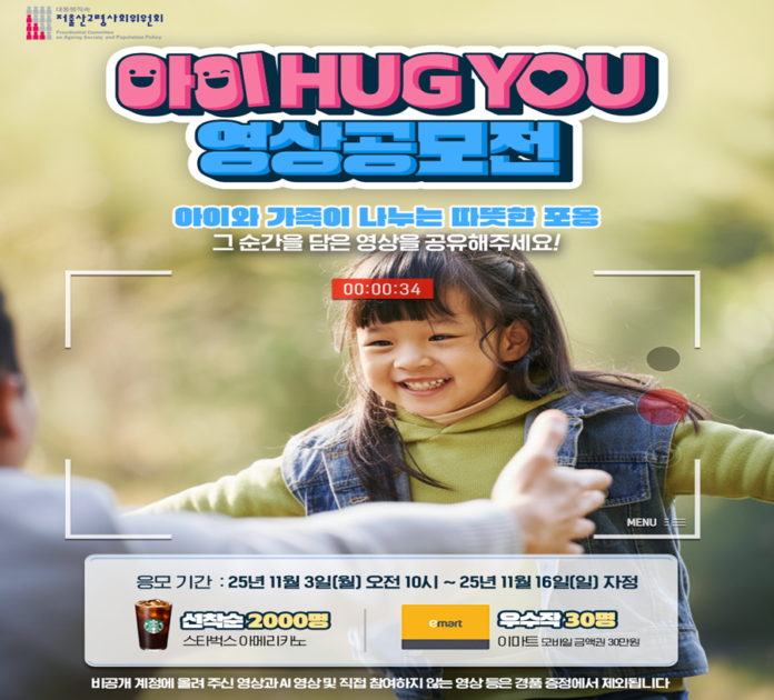 ‘저출산고령사회위원회'(이하 위원회)가 결혼·출산·육아에 대한 긍정적 인식을 확산하기 위해 아이와 가족 간의 따뜻한 포옹 영상을 공모한다.