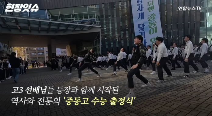'역사와 전통'을 자랑하는 서울 중동고등학교 학생들의 2024년도 수능 응원 퍼포먼스 장면, 사진= 연합뉴스 스틸 컷