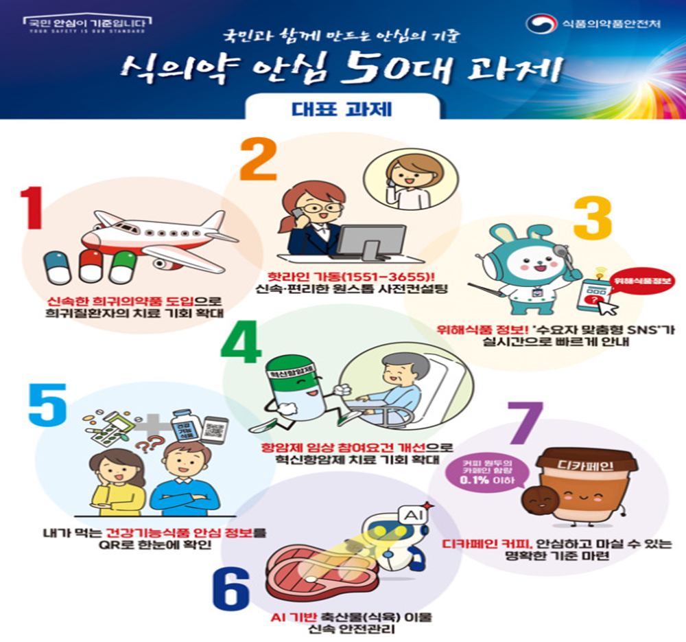 오유경 식약처장은 “국민과 함께 만든 식의약 안심 50대 과제가 국민 일상에서 효과를 체감할 수 있도록 법령 정비와 행정 조치를 신속히 추진하겠다”며 “앞으로도 국민 안전과 국내 식의약 산업 성장을 이끌고 국제기준을 선도하는 정책을 지속적으로 추진하겠다”고 밝혔다.