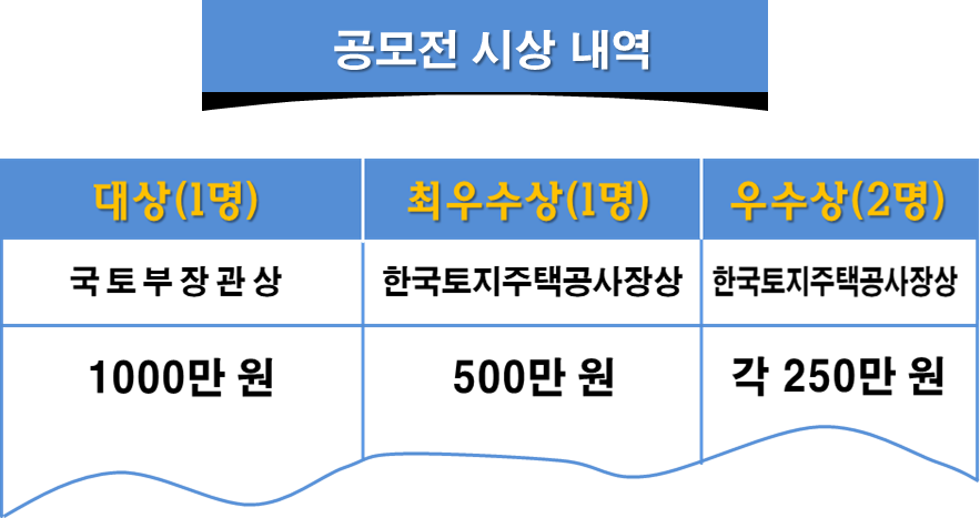 시상은 대상(국토부 장관상, 1000만원)을 포함해 총 4점이 선정되며, 상금은 총 2000만원이다. 최우수상 1명에게 500만원, 우수상 2명에게 각 250만원이 주어진다. 심사는 12월 초 진행되며, 발표 및 시상식은 12월 중 열린다.