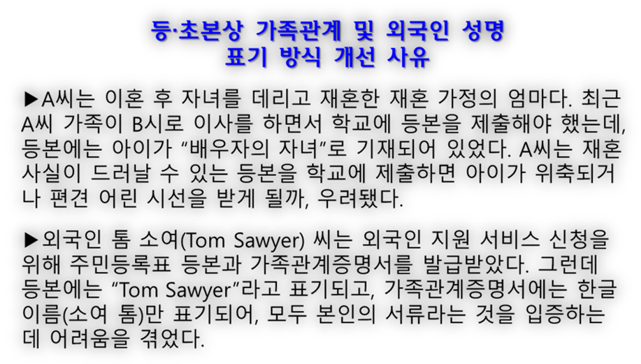그동안 재혼가정의 경우 등본에 자녀가 ‘배우자의 자녀’로 표기돼 학교나 관공서에 서류를 제출할 때마다 재혼 사실이 드러나는 문제가 있었다. 이 때문에 자녀들이 위축되거나 편견 어린 시선을 받을 수 있다는 우려가 제기돼 왔다.