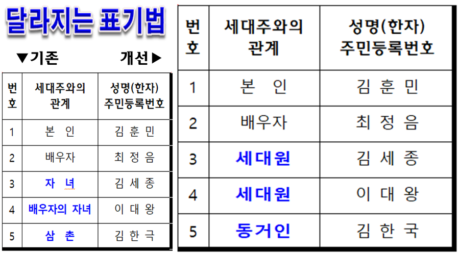 개정안에 따르면 세대주의 배우자를 제외한 가족(부모, 조부모, 형제자매, 자녀 등)은 모두 ‘세대원’으로, 그 외에는 ‘동거인’으로 간소화해 표기된다. 다만 민원인이 원할 경우 기존처럼 상세한 가족관계를 표기할 수도 있다.