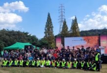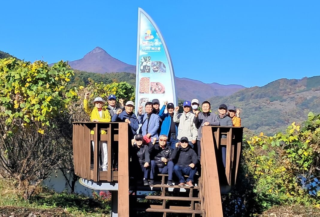 백운산 억불봉이 보이는 전망대에서 기념촬영하고 있는 금호그라운드골프회 여순유적지 답사팀. 사진=이경희