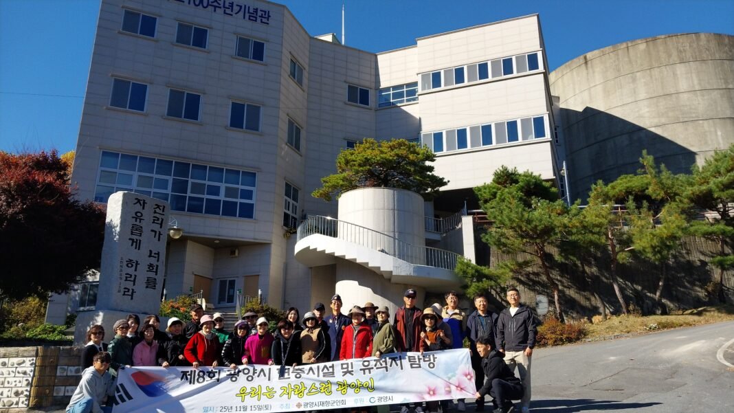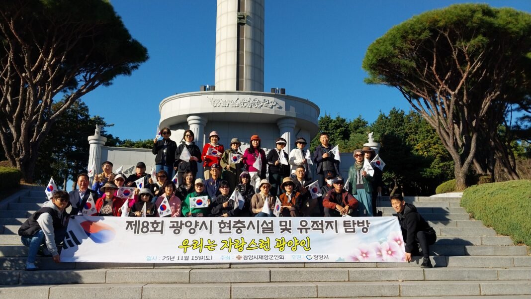 광양시 재향군인회(회장 김백열)는 11월 15일 ‘우리는 자랑스런 광양인’이라는 슬로건 아래 시민과 함께하는 현충시설 탐방 행사를 진행했다. 이날 행사에는 30여 명의 회원이 참여해 중마동 현충탑과 광양기독교 100주년 기념관 등을 방문했다.
