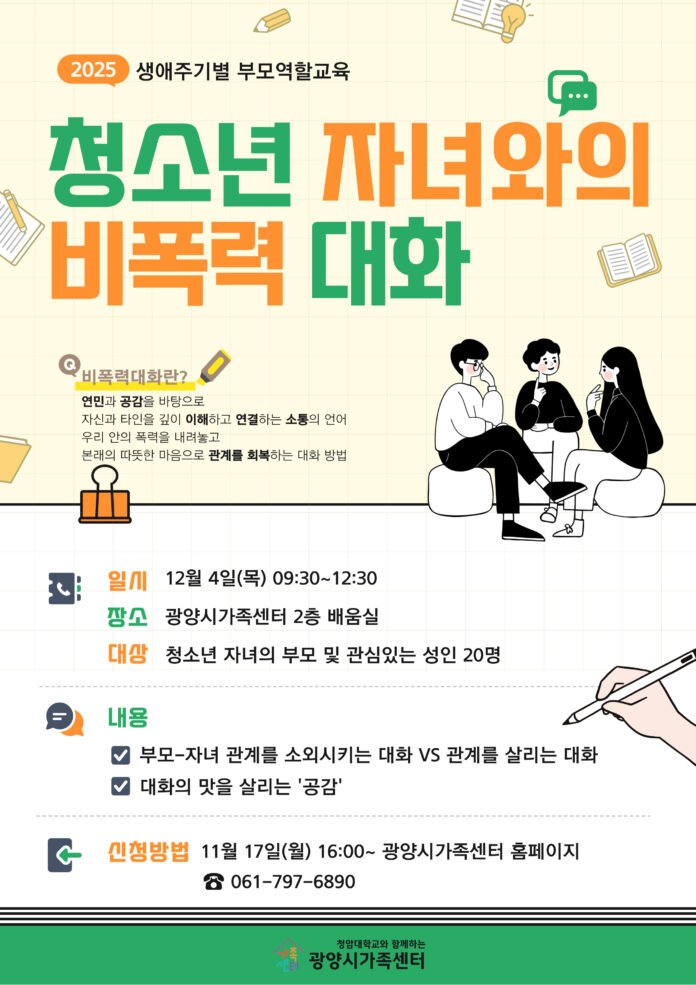 광양시가족센터가 오는 12월 4일 학령기 자녀를 둔 부모를 대상으로 ‘청소년 자녀와의 비폭력대화’ 부모교육을 개최한다. 이번 교육은 부모와 자녀의 관계를 한층 더 깊고 따뜻하게 만들 수 있도록, 소통의 질을 실질적으로 높이는 것을 목표로 기획됐다.