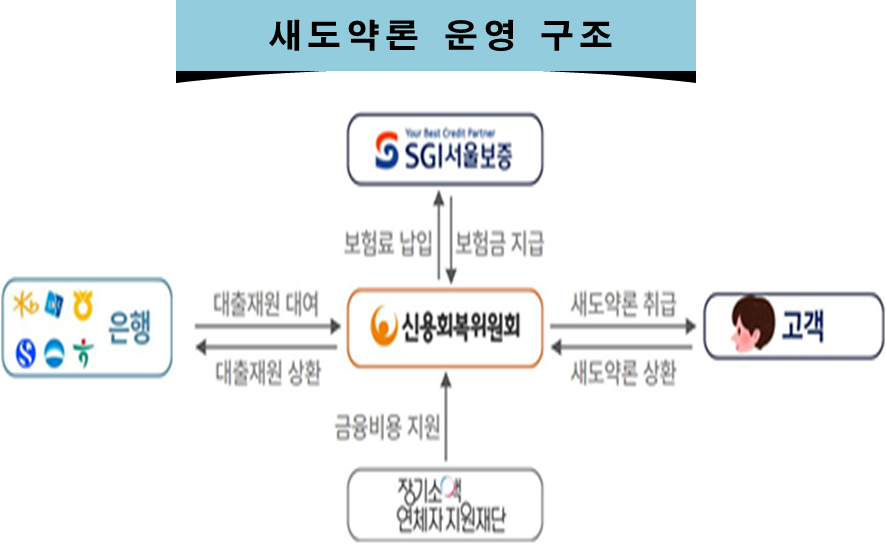 새도약론 운영 재원으로는 과거 금융권이 채무조정을 위해 설립한 장기소액연체자 지원재단의 잔여 재원(약 1000억원)이 활용된다. 프로그램은 3년간 한시 운영된다.