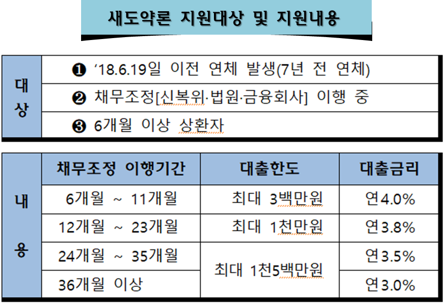 새도약론은 지난 10월 1일 출범한 ‘새도약기금’의 후속 조치로, 총 5500억원 규모다. 7년 전(2018년 6월 19일 이전) 연체가 발생했지만 이미 채무조정을 받아 빚을 성실히 갚고 있어 새도약기금 혜택을 받지 못하는 사람들을 지원하기 위해 마련됐다.