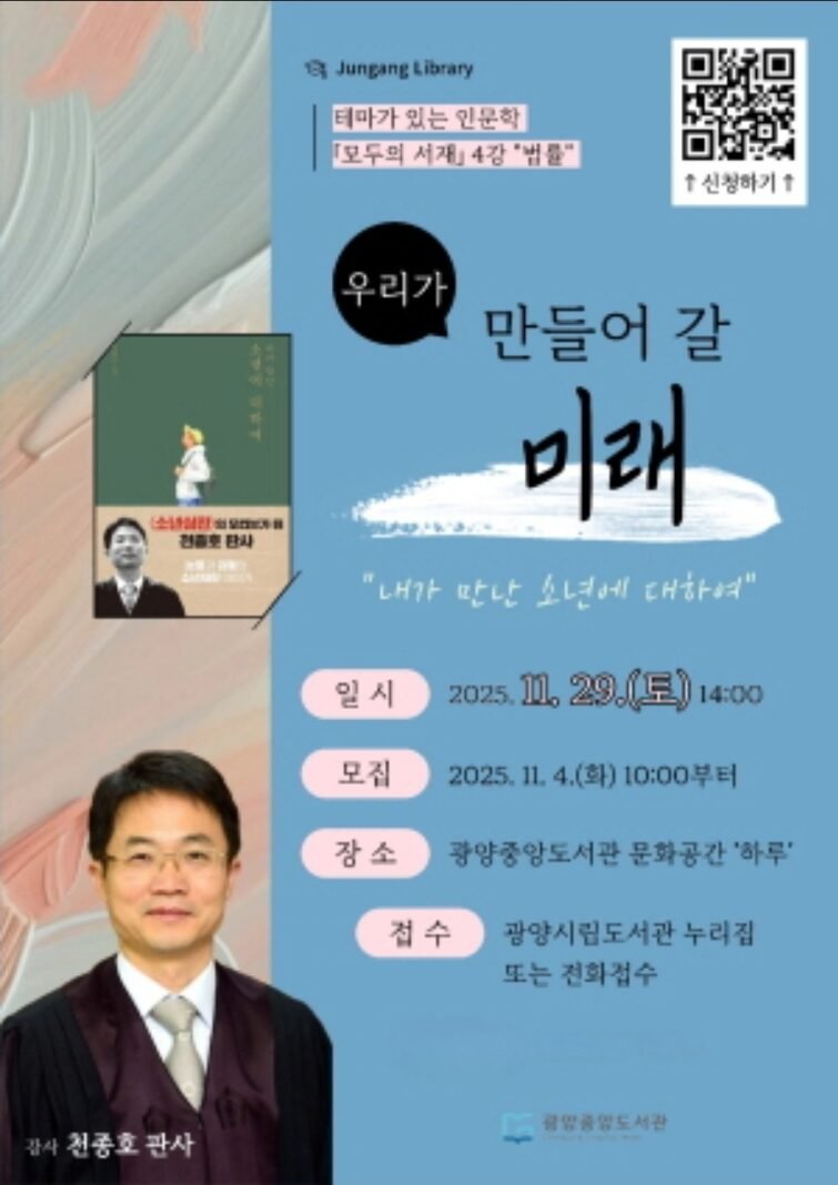 광양중앙도서관이 2025년 인문학 프로그램 '모두의 서재' 제4강 연사로 천종호 판사를 초청해 강연을 연다. 강연은 11월 29일 오후 2시, 별관 1층 문화공간 '하루'에서 열린다. 사진=광양중앙도서관