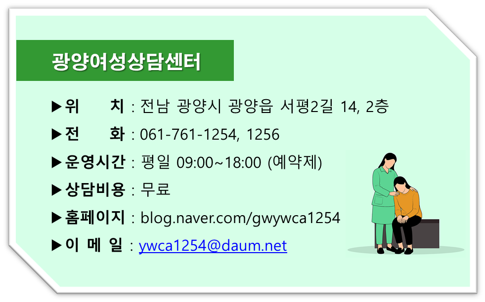 또한 광양여성상담센터는 피해자뿐 아니라 불안하거나 누군가의 도움을 찾는 모든 여성에게 열려 있다. 도움이 필요하거나 주변에 어려움을 겪는 이가 있다면 광양여성상담센터(061-761-1254)로 연락하면 된다.