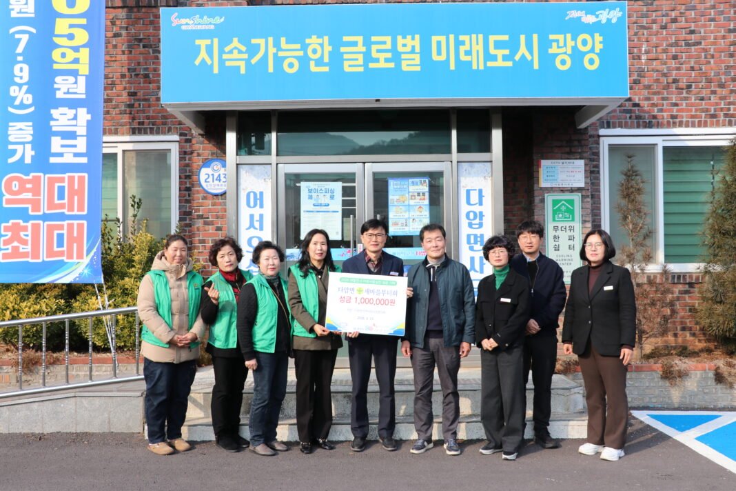 다압면새마을부녀회(회장 심정애)는 지난 1월 13일 다압면사무소에서 지역사회를 위한 나눔 실천의 일환으로 (재)광양시사랑나눔복지재단(이사장 김재경)에 성금 100만 원을 전달했다.