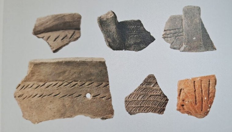 돈탁패총에서 출토된 유물 토기 조각- 발굴된 유물들은 기원전 3000년~2,000년 시기로 추정되믄 토기 조각, 갈돌, 동물 뼈 등, 또한 갓굴, 참굴, 꼬막, 백합 등 조개더미와 피뿔고동 등의 패각이 확인되었다. 사진=목포대박물관