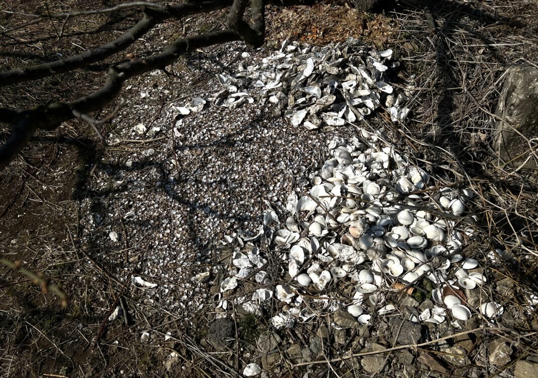 돈탁마을에서 근래에 생활 쓰레기로 패기된 조개더미 모습 – ‘돈탁패총’은 사람들이 먹고 버린 조개껍데기가 오랜 기간 쌓여 만들어진 유적이다. 광양 오사리 돈탁마을 인근과 진정리 중산마을 인근에서 신석기 시대 조개더미(패총)가 발견되었다. 사진=문성식