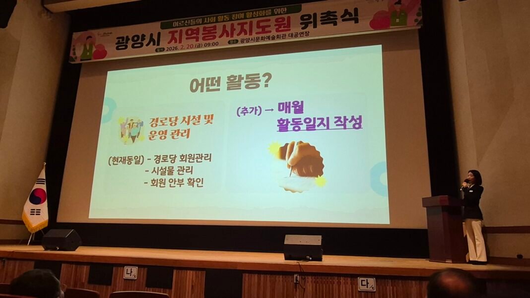 광양시는 경로당지역봉사지도원 운영 사업을 2026년부터 본격 시행에 들어갔다. 경로당 회장과 분회장으로 이루어진 지역봉사자지도원은 하루 2시간 이내, 월 4회 이상 경로당 시설물 유지관리와 안전관리 등을 수행하도록 하고, 이에 대한 활동비로 월 5만 원을 지급한다.