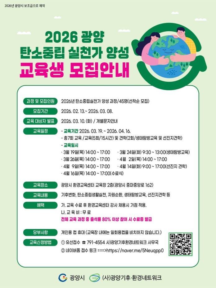 광양시(시장 정인화)와 (사)광양기후환경네트워크(상임대표 허형채)가 기후위기 시대에 대응하고 생활 속 탄소중립 실천 확산을 이끌어 갈 ‘탄소중립 실천가 양성교육’ 교육생을 모집한다.