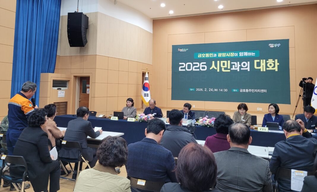 광양시가 지난달 24일 금호동 주민자치센터 대강당에서 ‘2026년 금호동 시민과의 대화’를 개최했다. 이번 행사는 정인화 시장이 직접 PPT를 활용해 시정 성과와 미래 비전을 설명하는 방식으로 진행되어 동민 100여 명의 큰 호응을 얻었다.