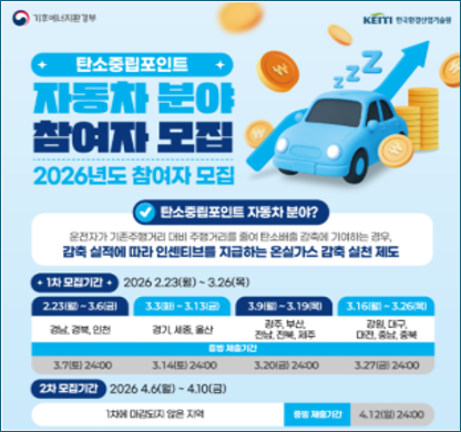 9일 환경부에 따르면, ‘기후위기 대응을 위한 탄소중립·녹색성장 기본법’에 근거해 운영되는 ‘탄소중립포인트 제도 자동차 분야’의 2026년도 참여자를 선착순으로 모집한다. 전남지역 모집 기간은 지난 3월 9일부터 오는 3월 19일까지이며, 증빙서류는 3월 20일 오후 12시까지 제출해야 한다.