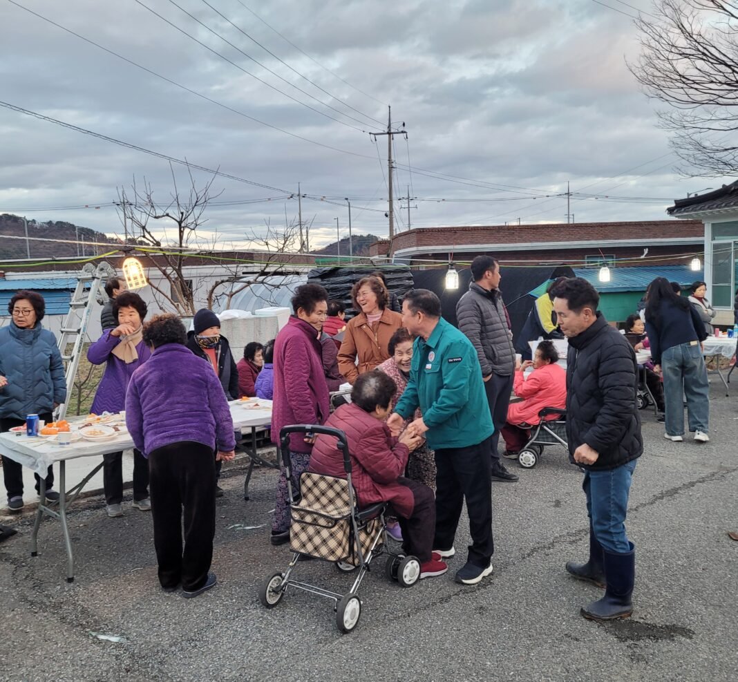 “주민 곁으로 다가가는 현장 행정”. 강병재 진상면장이 이천마을 달집태우기 현장을 방문해 어르신들의 손을 맞잡고 따뜻한 덕담을 나누며 주민들과 소통하고 있다. 사진=이호선
