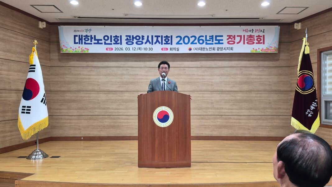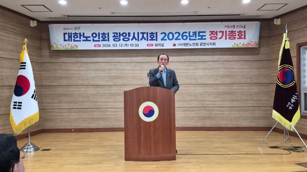 대한노인회 광양시지회는 지난 12일 오전 지회 회의실에서 대의원과 내외빈 300여 명이 참석한 가운데 2026년 정기총회를 개최했다. 전체 대의원 354명 가운데 284명이 참석해 성원이 성립됐으며, 개회식은 국민의례를 시작으로 내빈 소개, 기념사, 축사 순으로 진행됐다.