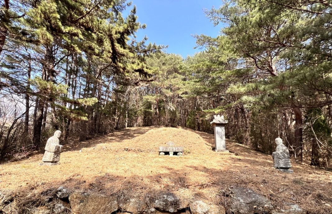 몇 번의 착오 끝에 마침내 도착한 선생의 묘소. 망부석 뒤로 석인석과 묘비가 위엄 있게 서 있었습니다. 묘소 옆에는 분홍빛 진달래가 피어 고단한 기자를 위로하고, 능선 오른쪽으로는 울창한 매실밭에서 날아온 매화 향기가 코끝을 간지럽혔습니다. 땀 흘려 올라온 보람이 온몸으로 전해지는 순간이었습니다.
