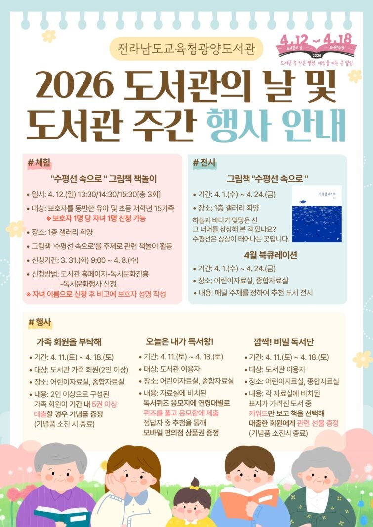4월 북큐레이션과 그림책 원화 전시는 4월 한 달간 누구나 자유롭게 관람할 수 있다. 그림책 ‘수평선 속으로’ 놀이 체험 프로그램은 오는 3월 31일부터 4월 8일까지 전라남도교육청광양도서관 홈페이지 내 독서문화행사 신청란을 통해 선착순으로 접수된다. 이벤트 참여자에게는 모바일 편의점 상품권과 기념품이 지급되며, 수량이 한정돼 있어 조기 소진될 수 있다.