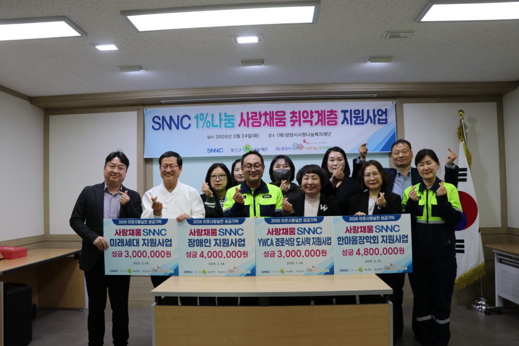 SNNC는 지난 3월 24일 ‘광양시사랑나눔복지재단'(이사장 김재경)에 성금 1500만 원을 전달했다. 이번 성금은 임직원들이 매월 급여의 일정 금액을 기부해 조성한 기금으로, 관내 각 사회복지시설에 배분될 예정이다.